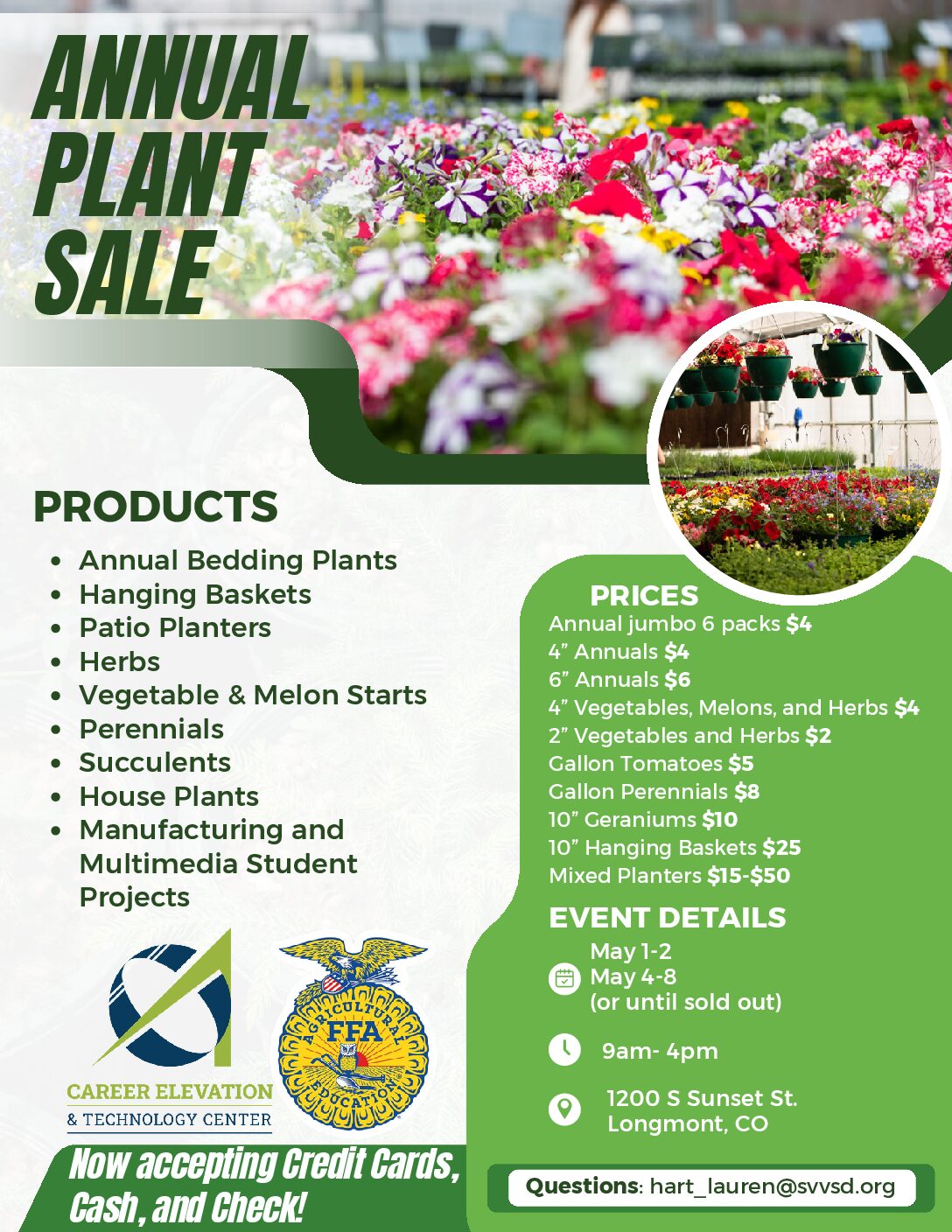 Join us in supporting our Agricultural Sciences program at the Career Elevation and Technology Center’s annual plant sale. This event, a beloved community tradition and a culmination of the year-long efforts of St. Vrain’s agriscience students, showcases the program’s focus on providing students with hands-on experience and leadership development in agricultural careers.